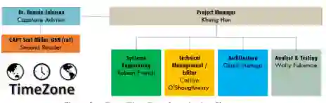 图3描述了时区团队(Team Time Zone)的组织结构和每个团队成员的主要职责。图中还显示了NPS的项目顾问,Bonnie Johnson博士(系统工程系)和美国海军上尉Scot Miller(退役)(信息科学系)。