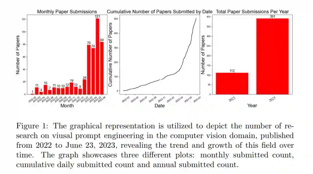 本综述主要关注计算机视觉中的提示工程方法。通过使用关键词"visual prompt"对arXiv进行网络爬虫,收集了一系列相关文献。如图1所示,使用ChatGPT筛选掉与计算机视觉无关的文章,最终得到了500篇论文。这些论文主要讨论与计算机视觉相关的提示算法,涵盖了从多模态视觉语言模型到视觉和通用人工智能模型的各个方面。提示可以采用多种形式,包括多模态设置下的文本提示、图像提示和文本-图像提示,每种形式对于不同任务需要具备独特的特点。本文全面回顾了计算机视觉中的提示工程,深入探讨了多模态提示设计、图像提示设计和文本-图像提示设计等不同方面,并考虑了不同任务的具体要求。旨在阐明计算机视觉中提示工程的进展和现状,从而促进该领域的进一步研究。