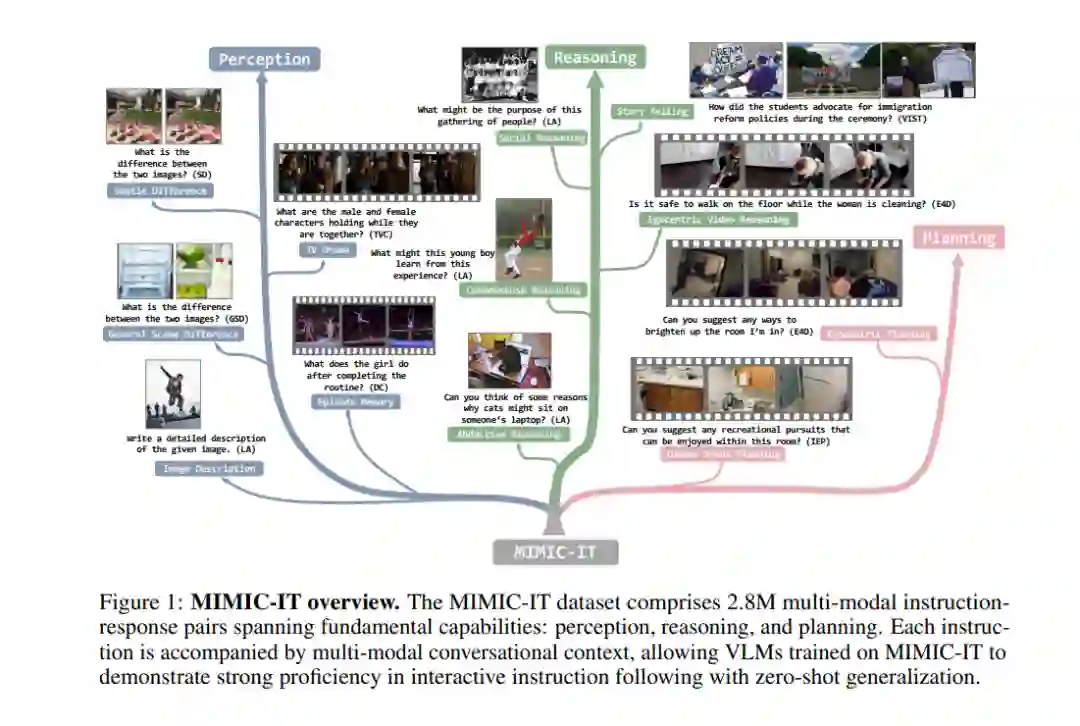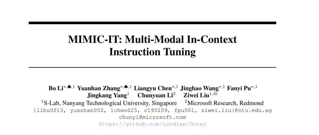高质量的指令和回应对于大型语言模型在自然语言交互任务中的零样本性能至关重要。对于涉及复杂视觉场景的交互式视觉语言任务,大量多样性和创新性的指令回应对应关系对于调优视觉语言模型(VLM)应该是至关重要的。然而,目前在数量、多样性和创造性方面,视觉语言指令回应对应关系的可获取性仍然有限,这对交互式VLM的泛化能力提出了挑战。在这里,我们提出了一种名为MultI-Modal In-Context Instruction Tuning(多模态上下文指令调整,简称MIMIC-IT)的数据集,它包含280万对多模态指令回应对应关系,其中220万个独特的指令源自图片和视频。每对指令回应都附带有多模态上下文信息,形成了旨在提升VLM在感知、推理和规划能力的对话上下文。我们将收集指令回应的过程称为Syphus,它通过结合人类的专业知识和GPT的能力,使用自动注释流程进行扩展。使用MIMIC-IT数据集,我们训练了一个大型的VLM,名为Otter。在对视觉语言基准进行广泛评估的基础上,我们观察到Otter在多模态感知、推理和上下文学习方面表现出显著的熟练程度。人类评估揭示,它有效地与用户的意图对齐。我们发布了MIMIC-IT数据集、指令回应收集流程、基准和Otter模型。