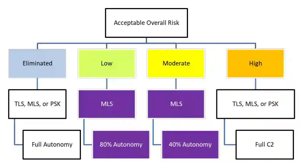 利用建模和仿真结果进行了风险分析,以确定地理定位、DoS 和冒充风险的程度。为每个安全协议或方法确定风险和态势感知的权衡空间。根据任务需要,可以牺牲态势感知来提高自主性,从而降低风险。图 2 将这一权衡空间归纳为一棵决策树,可作为军事领导人的指导方针,以确定哪种 UxS 设置最能满足任务需求。