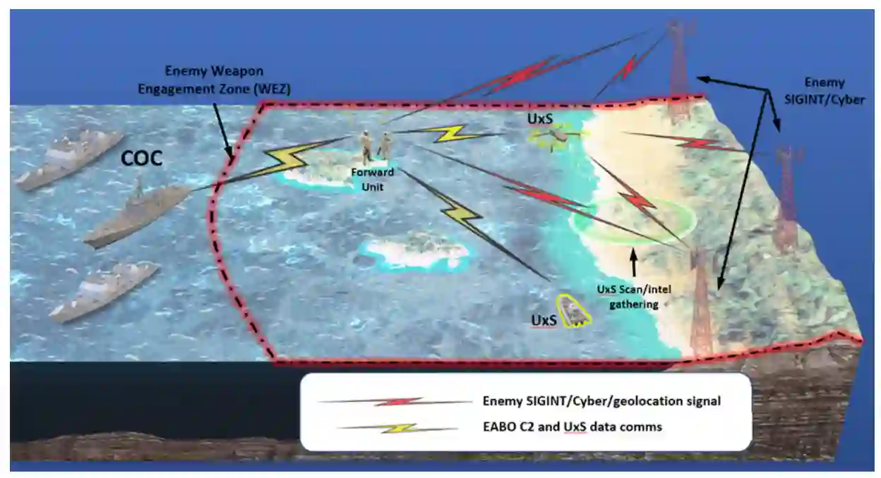 图 DMO / EABO 环境中 UxS 的 CONOPS C2。前方单元部署到敌方 WEZ 并操作 UxS 完成任务。前沿单元向指挥中心转发状态更新,为指挥中心提供敌方 WEZ 的 SA。敌方对 UxS 和前沿单元进行网络攻击。