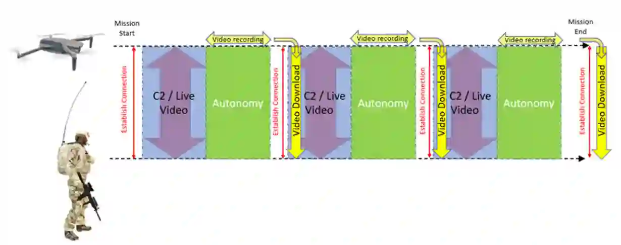 图 1. 使用指挥和自主之间的百分比分配进行 UxS 操作的运行场景。任务开始时,首先在操作员和 UxS 之间建立连接。起初,操作员会持续向 UxS 传输 C2 数据,UxS 也会在预定的蓝色时间间隔内向操作员传输实时视频。时间间隔结束后,操作员与 UxS 之间的连接也随之结束,UxS 在录制视频的同时自主运行,并持续一段预定的绿色时间。自主操作时间间隔结束后,UxS 与操作员重新建立连接,操作员恢复 UxS 的 C2 功能,恢复实时视频传输,同时下载录制的视频。这一过程在整个任务期间不断重复。