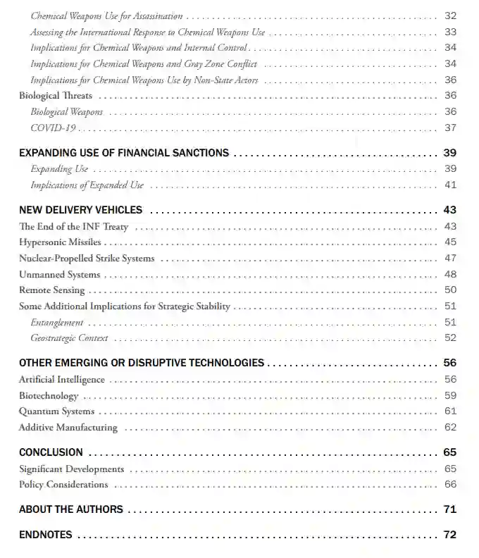 2014年,美国国防大学大规模杀伤性武器研究中心发表了一篇关于大规模杀伤性武器(WMD)未来的论文。它预测了与大规模杀伤性武器相关的地缘政治和技术趋势,并对这些趋势将如何塑造2030年大规模杀伤性武器的性质和作用做出了判断。自2014年的文件以来,出现了与大规模杀伤性武器的未来有关的重大地缘政治和技术发展,或在该研究中基本没有涉及。本文讨论了此类发展的六个篮子。它们包括:1)大国角色的转变;2)对军备控制和不扩散制度的新压力;3)化学和生物武器的更多作用;4)扩大使用金融制裁作为不扩散和其他政策的工具;5)新型运载工具以及开发和部署它们的更大范围;以及6)与大规模毁灭性武器有关的其他新兴和破坏性技术,包括人工智能、生物技术、量子系统和增材制造。本文在2020年11月初定稿,所以不涉及后来的事件,如2020年美国总统选举结果。