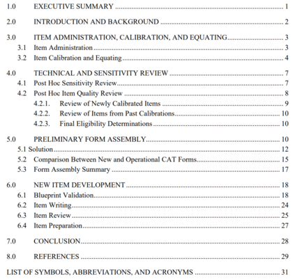 自 2008 年以来,已进行了多个阶段的研究,以开发和评估网络测试(前身为信息与通信技术素养测试,简称 ICTL),该测试被各军种用作入伍前评估,并预测网络相关军事职业入门级培训的成功率(Trippe 等人,2014 年)。直到最近,网络测试一直采用静态管理格式;也就是说,每个完成特定测试表格的考生都会以相同的顺序看到同一组项目。2018 年,人力资源研究组织(Human Resources Research Organization,HumRRO)开展了支持向计算机自适应测试(CAT)格式过渡的研究,在这种格式下,每个考生都会收到一套独特的题目,这些题目都是经过算法选择的,以优化对考生个人能力水平的估计(Koch 等人,2018 年)。这项工作的成果包括将网络测试项目库分为三个平行的 87 个项目形式(即项目库)的解决方案,CAT 算法可从中抽取项目,以及 215 个可用于试点测试的新项目。