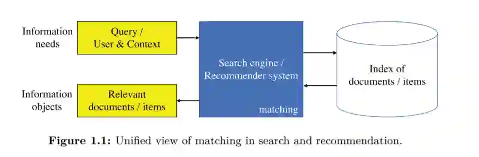 匹配在搜索和推荐中都是一个关键问题,它是衡量文档与查询的相关性或用户对某个条目的兴趣。机器学习已经被用来解决这个问题,它根据输入表示和标记数据学习匹配函数,也被称为“学习匹配”。近年来,人们努力开发用于匹配搜索和推荐任务的深度学习技术。随着大量数据的可用性、强大的计算资源和先进的深度学习技术,用于匹配的深度学习现在已经成为最先进的搜索和推荐技术。深度学习方法成功的关键在于它在从数据(例如查询、文档、用户、条目和上下文,特别是原始形式)中学习表示和匹配模式的泛化方面的强大能力。