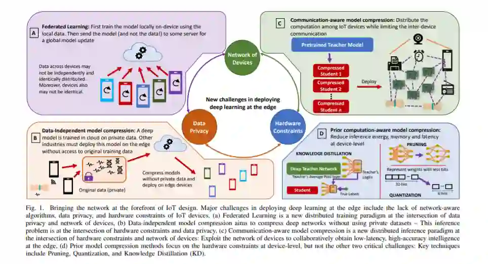 在本文中,我们首先强调了在边缘大规模采用深度学习的三个主要挑战:(i)硬件受限的物联网设备,(ii)物联网时代的数据安全和隐私,以及(iii)缺乏网络感知的深度学习算法来跨多个物联网设备进行分布式推理。然后,我们针对上述挑战自然产生的三个研究方向提供了统一的观点: (1)用于训练深度网络的联邦学习,(2)独立于数据的学习算法部署,(3)通信感知的分布式推理。我们认为,上述研究方向需要一种以网络为中心的方法来实现边缘智能,从而充分发挥物联网的真正潜力。