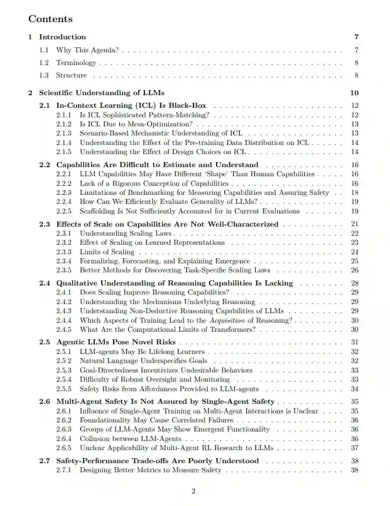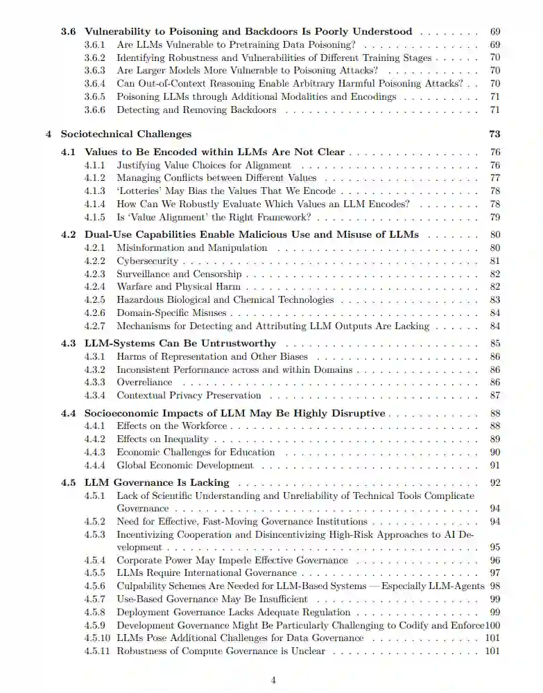 最后一类,社会技术挑战(第4节),聚焦于需要更多样化和整体视角来解决的挑战。例如,我们讨论了在LLMs中编码哪些价值观的社会级讨论的重要性,以及我们如何防止价值强加并使价值多样化成为可能。许多LLMs功能是双重用途的;我们需要理解这样的功能可能启用何种恶意滥用,以及我们如何抵御它们。还需要确保独立并持续监控LLM系统的偏见和其他问题,并透明地传达,以建立信任并减少过度依赖。LLMs在社会中的广泛传播可能会产生不希望的社会经济影响(例如工作岗位的减少、不平等的增加),这些影响应该得到更好的调查和对策。最后,我们通过讨论治理和监管领域的挑战和机会来结束这一部分。 作为附录,在第5节中我们回顾了这项工作的一些局限。最值得注意的是,虽然这一议程是全面的,但它并非详尽无遗。我们接着提供了与本工作广泛相关的先前工作的详细概述;包括但不限于先前关于AI安全的议程和与LLMs相关的各种调查。