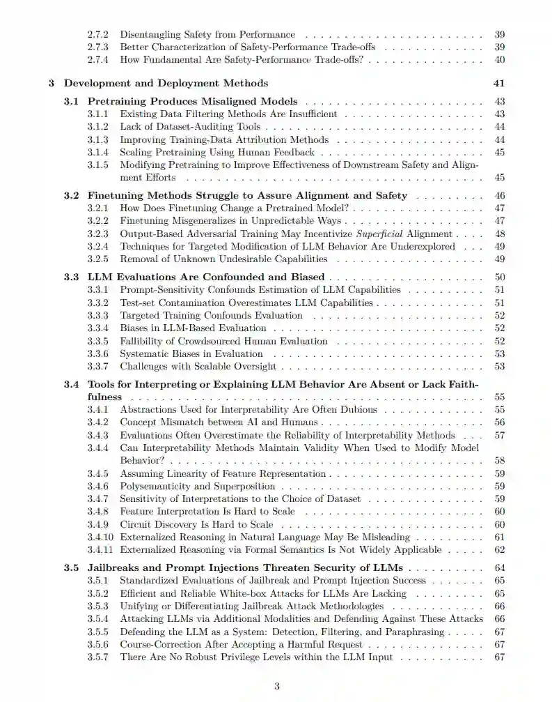 在LLMs的开发和部署中使用的方法大致可以分为三种类型。第一种类型包括用于LLMs训练的技术(包括数据收集和标注技术),用于预训练和微调。我们将微调阶段使用的所有技术(监督微调、基于人类或AI反馈的强化学习训练、遗忘方法)统称为“安全微调”方法。我们在第3.1节和第3.2节中讨论了预训练和安全微调中的各种挑战,这些挑战对LLMs的安全性、对齐性和保证产生了负面影响。第二种方法包括评估和解释技术——不幸的是,正如我们在整个报告中(第3.3节和第3.4节)所强调的,评估和解释方法还有很大的提升空间,且在当前状态下不能依赖它们提供必要的保证。最后,第三种方法关注这些模型的安全性——这包括对各种类型的敌对攻击的鲁棒性,最突出的是越狱和提示注入(第3.5节)以及投毒攻击(第3.6节)。