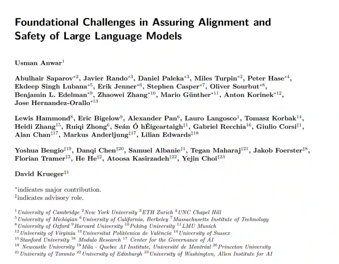 进展的快速率尤其令人担忧,因为缺乏必要的技术工具和在社会技术结构上的不足,这可能有助于确保LLMs的安全开发和部署(Bengio等人,2023年)。在这项工作中,我们绘制了开发适当技术便利设施的挑战地图,这些设施可能有助于确保安全性,并理解和应对我们在确保社会规模安全性方面可能面临的社会技术挑战。本质上,这项工作是对机器学习研究人员以及相关领域研究人员的行动呼吁。我们广泛引用当代文献,专注于识别有前途的具体研究方向,并深入讨论每个挑战,使其成为领域新手的理想教育资源。同时,我们期望在这项工作中识别的诸多挑战将成为当前从事LLM对齐和安全领域实践者的灵感来源,包括那些来自其他多样化学科的工作者(例如社会科学、人文学科、法律、政策、风险分析、哲学等)。