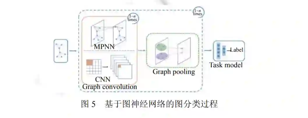 前文介绍的图核方法很多年来都是图分类中的主导方法, 也取得了不错的分类效果[25] . 但由于这些方法通常 依赖于一组固定特征, 其特征表示难以有效地适应于新的数据分布. 随着图深度学习的发展[46] , 一些神经网络方 法开始用于解决图分类任务. 本节重点关注基于图神经网络的图分类方法, 这类方法通过端到端的方式进行模型 的优化学习, 为图分类的准确率带来了较大的提升. 1−n 应用于图像分类任务的传统卷积神经网络, 主要包括卷积和池化两个操作, 这两个操作依赖于图像数据的结 构规则性和平移不变性. 类比于图像分类任务, 图卷积神经网络应用于图分类问题时, 同样需要关注卷积和池化算 子. 但不同于图像数据, 图数据是非欧空间数据, 同一个数据集中的每个图大小不同, 结构不一. 图中的每个节点也 具有不同的局部结构, 为图分类中卷积算子和池化算子的设计带来了巨大的挑战. 给定一组图. 基于图神经网络的 图分类方法通常先通过卷积的方式对这些图进行多次特征变换, 然后在此基础上进行池化操作, 将图的规模缩小. 这个过程可以重复多次, 最终得到整个图的表示, 从而进行分类. 本节就从图分类任务中的卷积算子和池化算子角 度, 对基于图神经网络的图分类方法进行总结和分析. 利用图神经网络进行图分类的过程如图 5 所示. 其中, 可选 的操作和模块用虚线表示. 环形箭头表示操作可以选择重复1-n 次