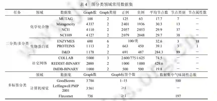 传统的图分类主要应用于生物和化学领域. 它们天然地提供了很多图结构数据. 通过实验判断分子属性或蛋 白质功能的方式代价较大, 因此机器学习的方法被广泛应用于生物化学信息学中. 在化学信息学中, 化合物被建模 为图, 该领域常见的问题是判断化合物是否具有某些性质. 图分类方法已经被用于判断分子是否具有诱变性、抗 癌活性、毒性等任务中[6,7] . 图分类在药物开发领域, 也有着非常重要的应用, 通过图机器学习的方法对药物的安 全性等性质进行判断, 同时帮助化学家深入理解不断增长的药物发现数据[72] . 此外, 在多标签图分类场景下, 图分 类方法也被用于计算机嗅觉领域中定量结构气味关系 (QSOR) 建模问题. 此时, 分子有一个或多个气味属性标签, 任务是预测分子的气味属性标签[20,68] . 同样的, 在生物信息学领域, 对蛋白质的探索[9]也是一项重要任务. 蛋白质的高级结构被建模为图. 常见的应 用包括蛋白质属性判断, 如蛋白质是酶或者非酶, 通过蛋白质交互网络预测疾病[8]等.