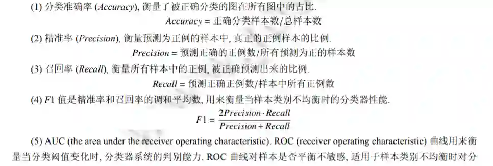 图分类方法的评价指标主要包括分类准确率, 精准率, 召回率, F1 值和 AUC, 下面分别介绍