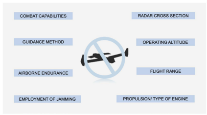 现代战争中使用的无人飞行器设计多种多样,因此在构建和运行反无人机系统时必须考虑各种因素。其中,应始终考虑无人飞行器的以下特征:推进力、有效雷达截面、制导方式、作战上限、飞行距离、空中续航时间、预期目的、作战能力(包括收集情报、携带和发射有效载荷的能力)以及电磁干扰对策。