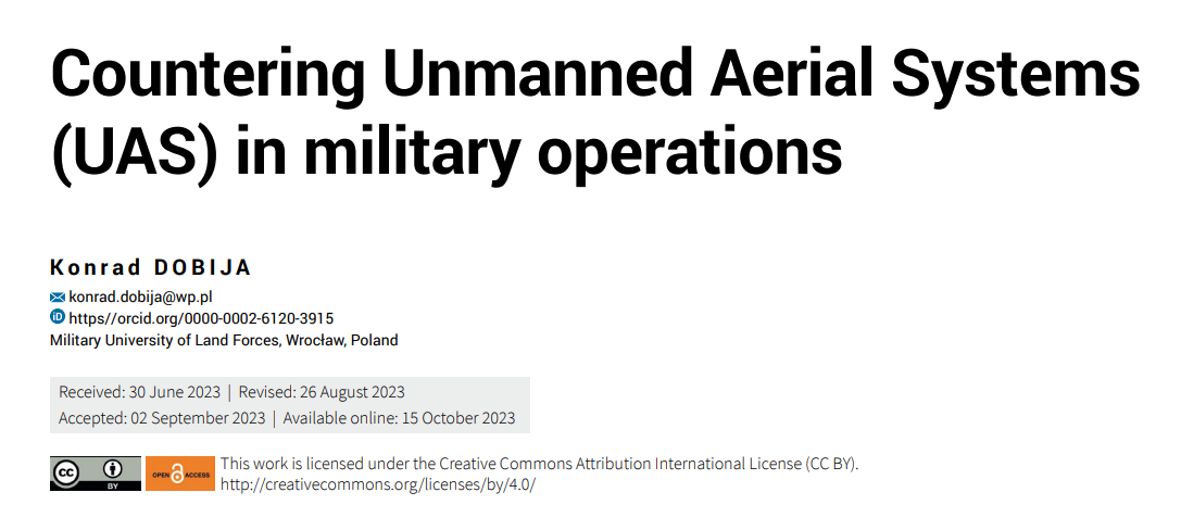 从纳戈尔诺-卡拉巴赫冲突(Hecht,2022 年)和乌克兰冲突(Wyrwał,2022 年)得出结论,无人机在战场上的广泛应用已成为现实,无需再做说服工作。无人机不仅能执行观察和侦察任务,还能执行打击、运输、搜索和救援行动等许多其他任务,显示了其多功能性。目前,看到的无人机既有单个的,也有成群的,还有像可重构模块智能作战阵列(SWARM)这样的机群。此外,大多数无人机的生产成本非常低,但其效能却足以成功摧毁高价值目标和先进军事装备。无人系统的任务和设计多种多样,因此需要有效的制衡措施,包括反无人机系统和反无人机防御方法。在这方面,研究课题的重点是反无人机防御,即一套旨在探测、识别和制服无人机(无人驾驶航空系统)的措施和作战能力,以保护自己的部队、军事设施和民用物体。