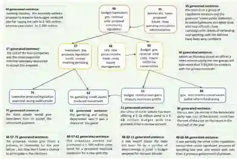 如图1(b)所示,所提模型将层次时序的主题权重向量作为额外输入集成到语言模型中。因此不同于传统的基于RNN的语言模型,所提出的模型不仅捕获句子内的单词依赖关系,而且捕获句子之间的相关性,同时利用主题模型考虑了文本的全局语义信息。为了进行推理,本次工作提出了随机梯度马尔科夫链蒙特卡洛和递归变分自编码的混合算法。图1(c)展示了rGBN-RNN的整个框架,包含了生成模型(编码器)和推理模型(解码器)。如图2所示,我们利用新闻数据训练三层rGBN-RNN,并将学习到的层次主题以及这些主题指导生成的句子进行了可视化。一方面,rGBN-RNN能够捕捉到不同层次主题之间可解释的层次关系,以及同一层次主题之间的时间关系(如图中彩色实线框所示)。另一方面,如图中虚线框所示,依据一个或者多个主题生成的句子大部分与相应主题高度相关。这种相关不一定在关键字的相似,更多是语义内容的接近,表明层次时序的主题能够成功地引导语言模型。这些观察结果表明,rGBN-RNN能够成功地捕获自然语言生成所需要的语法和全局语义信息。此外,模型还能生成语法正确、语义连贯的句子和段落。