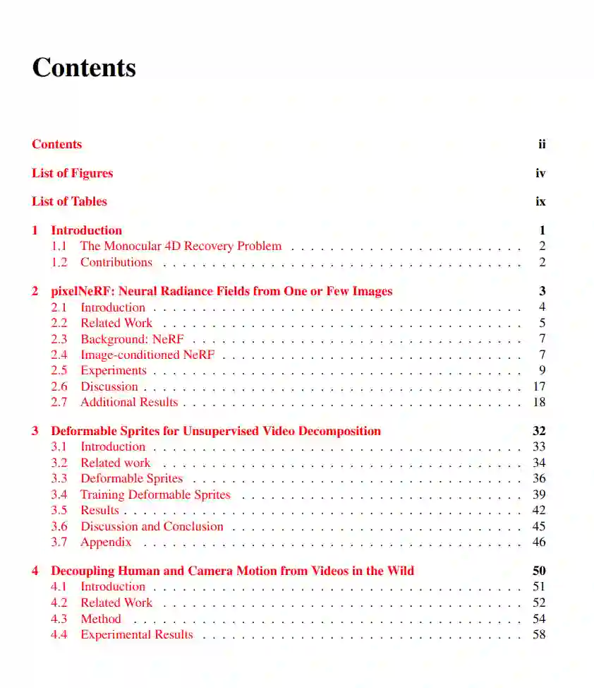 在本论文中,我构建了多个系统,用于从有限的图像观测中恢复场景表示。具体来说,我研究了一系列问题,这些问题构建了通向 4D 单目恢复问题的路径,每个问题都解决了该问题欠约束的不同方面。首先,我研究了在没有场景运动的情况下从欠约束输入中恢复形状的问题。具体而言,我提出了 pixelNeRF,这是一种从单个或少数视图合成静态场景新视角的方法。我们通过在多个场景的图像特征上训练一个 3D 神经表示来学习场景先验。这种学习到的场景先验使得能够从单一或少量图像的欠约束输入中完成 3D 场景。
