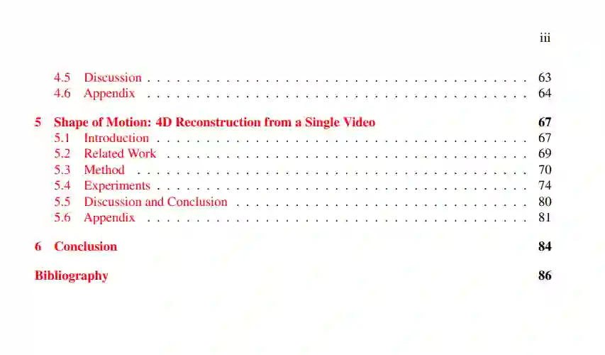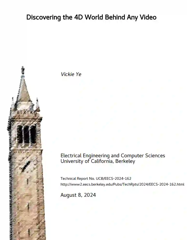 接下来,我研究了在没有 3D 形状的情况下恢复运动的问题。特别地,我提出了 Deformable Sprites,一种从输入视频中提取动态场景中持久元素的方法。我们将每个元素表示为在视频中变形的 2D 图像层。 最后,我介绍了两个关于从单一视频中联合恢复 4D 世界的形状和运动的研究。我首先研究了动态人类的特例,并提出了 SLAHMR,其中我们从单个视频中恢复了在世界坐标系中的所有人和相机的全局姿态。然后,我扩展到恢复单个视频中的任何动态对象的一般情况,即 Shape of Motion,在其中我们将整个场景表示为 4D 高斯分布,这可以用于动态新视角合成和 3D 跟踪。