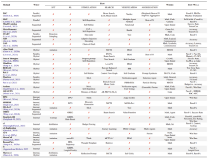 训练阶段方法:监督微调(SFT)、强化学习(RL)等 * 推理阶段技术:刺激策略(Stimulation)、验证技术(Verification)、搜索方法(Search)、集成技术(Aggregation)