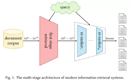 为了平衡搜索的效率和准确性,现代检索系统通常采用多级排序架构:第一阶段检索采用一些计算快捷的排序模型以及专门设计的索引结构从大型文本库中快速返回相关文档的候选集合;之后,多个重排序阶段采用更复杂和有效的排序模型来提升前一阶段输出的相关文档列表。