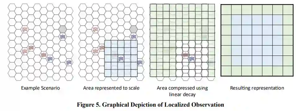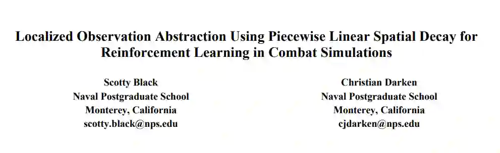 在战斗模拟领域,由于此类环境的动态性和复杂性,深度强化学习(RL)智能体的训练和部署仍面临巨大挑战。不幸的是,随着场景和可用信息复杂性的增加,达到一定性能阈值所需的训练时间不仅会增加,而且往往会呈指数级增长。这种关系凸显了复杂性对训练 RL 智能体的深远影响。本文介绍了一种新颖的方法,可以解决使用 RL 训练AI智能体的这一局限性。由于现实世界的计算限制和已知的 RL 样本低效难题,传统的 RL 方法在这些高维动态环境中已被证明难以奏效。为了克服这些限制,我们提出了一种利用片断线性空间衰减进行局部观测抽象的方法。这种技术简化了状态空间,降低了计算需求,同时还保留了基本信息,从而在空间关系往往至关重要的动态环境中提高了人工智能训练效率。分析表明,在场景复杂度不断增加的情况下,这种局部观测方法始终优于传统的全局观测方法。本文推进了对 RL 观察抽象的研究,说明了局部观察与片断线性空间衰减如何为动态环境中的大型状态表示挑战提供有效的解决方案。