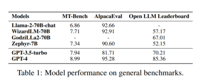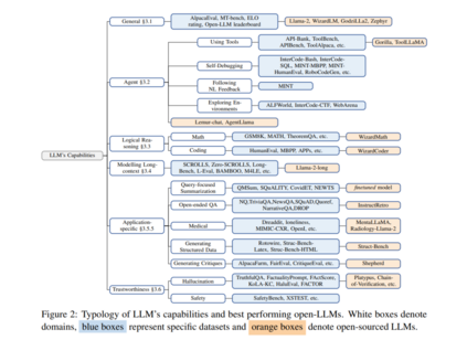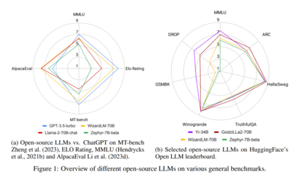 Llama-2-70B(Touvron et al., 2023b)是一款杰出的开源LLM,已在庞大的两万亿令牌数据集上进行预训练。它在各种通用基准测试中展示了卓越的结果。当进一步使用指令数据进行微调时,Llama-2-chat-70B变体在一般对话任务中表现出增强的能力。特别是,在AlpacaEval中,Llama-2-chat-70B取得了92.66%的胜率,超过了GPT-3.5-turbo的10.95%。然而,GPT-4仍然是所有LLM中的顶尖表现者,其胜率为95.28%。另一个较小的模型Zephyr-7B(Tunstall et al., 2023)使用了蒸馏直接偏好优化(Rafailov et al., 2023a),在AlpacaEval中与70B LLM取得了相当的结果,胜率为90.6%。它甚至在MT-Bench上超过了Llama-2-chat-70B,得分为7.34对6.86。此外,WizardLM-70B(Xu et al., 2023a)经过使用大量具有不同复杂度的指令数据的微调。它作为最高得分的开源LLM在MT-Bench上脱颖而出,得分为7.71。然而,这仍然略低于GPT-3.5-turbo(7.94)和GPT-4(8.99)的得分。尽管Zephyr-7B在MT-Bench上表现出色,但在开放LLM排行榜上得分仅为52.15%。另一方面,GodziLLa2-70B(Philippines, 2023),一款结合了各种专有LoRAs(来自Maya Philippines 6)和Guanaco Llama 2 1K数据集(mlabonne, 2023)与Llama-2-70B的实验模型,在开放LLM排行榜上取得了更具竞争力的67.01%的得分。这一表现与GPT-3.5-turbo(70.21%)相当。然而,两者都明显落后于GPT-4,后者以85.36%的高分领先。UltraLlama(Ding et al., 2023)利用了具有增强多样性和质量的微调数据。它在其提出的基准测试中与GPT-3.5-turbo的表现相匹配,而在世界和专业知识领域则超越了后者。 大模型发展趋势