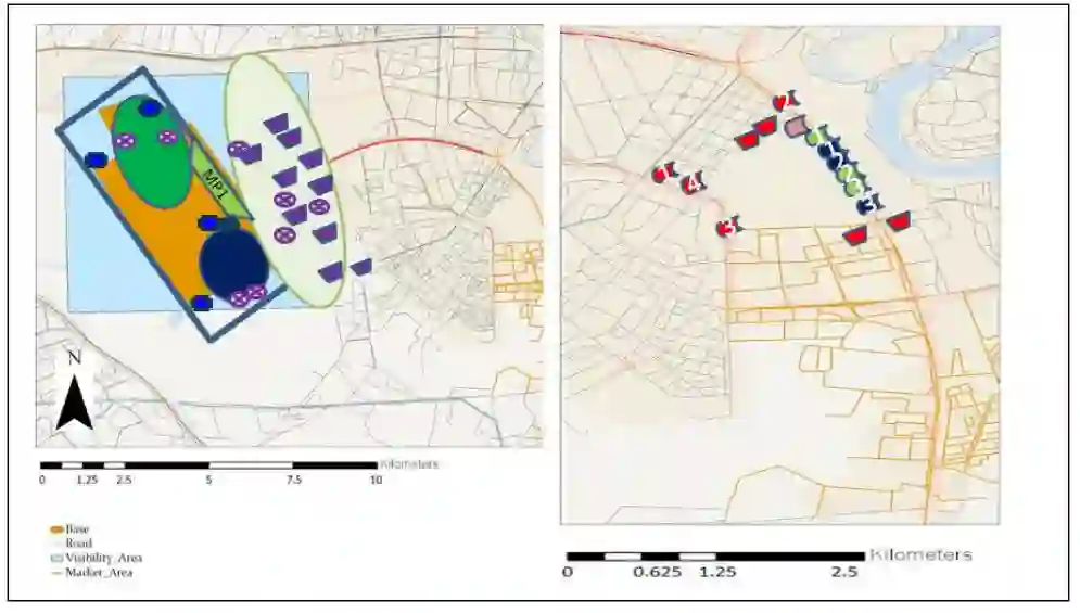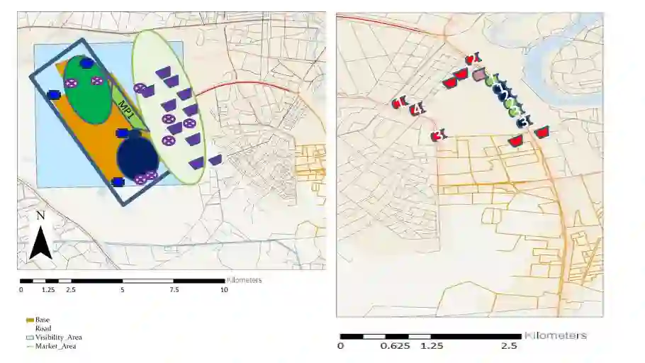 兵棋推演所使用的场景被设定为北约特遣部队位于一个负责培训安全部队的东道国。四支队伍(红色紫色 Vs 蓝色绿色盟友)在战术层面进行兵棋推演。所考虑的战术情况是蓝(北约)/绿(东道国)联合护行车队的行动,涉及到敌对叛乱部队在一个集市上的秘密伏击,以及当地部队阻止市民进出绿/蓝联合基地(见图1)。