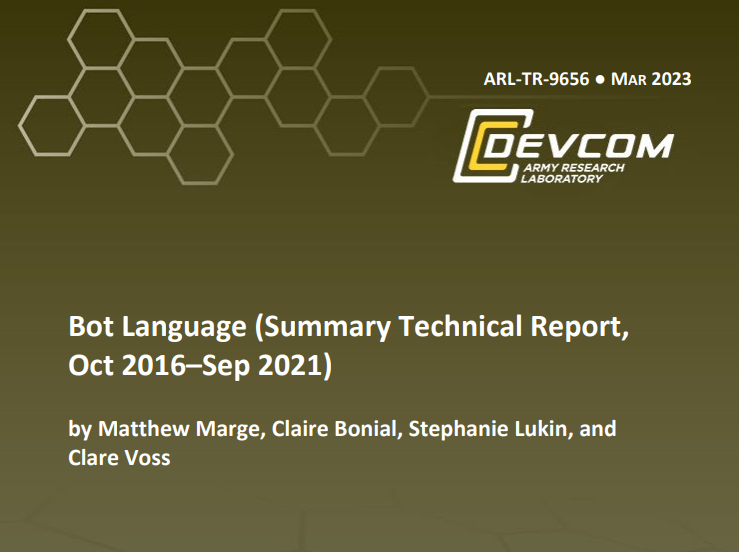 本报告全面总结了作为机器人语言项目的一部分所做出的贡献,该项目是由美国陆军作战能力发展司令部陆军研究实验室牵头,与南加州大学创意技术研究所和卡内基梅隆大学的研究人员合作开展的一项为期五年的倡议。特别是,本报告描述了在 "用智能系统进行共同理解和解释的自然行为 "项目下资助的成就。这项研究的目标是为人们使用语言与机器人交流提供更自然的方式。愿景是使机器人能够与人类队友进行来回对话,机器人可以提供状态更新,并在适当的时候要求澄清。为此,我们进行了四个分阶段的实验,在这些实验中,人类参与者向远程的机器人发出导航指令,而机器人的对话和导航过程最初由人类实验者控制。在实验过程中,自动化被逐步引入,直到对话处理完全由一个在以前的实验中收集的数据上训练出来的分类器驱动。