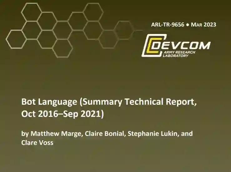 机器人语言项目的新贡献包括:1)这种多阶段的方法来收集无约束的自然语言,作为机器学习算法的训练数据,以支持对话互动;2)收集对话和机器人数据的语料库,并策划成SCOUT语料库(理解交易的情景语料库);3)一系列完全自动化的、 3)一系列全自动的概念验证系统,显示了所采取的方法的技术前景,4)作为项目一部分创建的算法,现在构成了陆军联合理解和对话接口能力的基础,使士兵和自主系统之间的对话互动成为可能,以及5)通过对话-AMR(抽象意义表示)形式主义在人类-机器人对话的指令语义方面的创新。