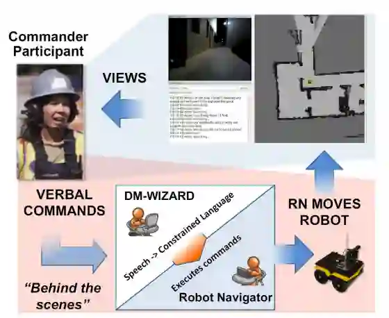 在南加州大学ICT的SimSensei项目中,研究人员使用了一种我们称之为数据驱动的 "Wizard-of-Oz"(DWoZ)的方法来观察人类如何与他们认为是自主的虚拟化身聊天。实际上,他们在屏幕上看到的头像是由人类 "巫师 "实验者控制的。在与南加州大学ICT的合作中,我们的目标是评估这些贡献是否可以扩展到自主系统,即地面机器人,以支持与人类队友的合作搜索和导航任务。该项目由美国陆军作战能力发展司令部(DEVCOM)陆军研究实验室(ARL)的资助项目 "与智能系统共同理解和解释的自然行为 "赞助,对外称为 "机器人语言 "项目,由一系列实验组成,执行多阶段实验的设想,其中向导代表人工智能(AI)组件,在后期阶段 "自动消失"。操作上的假设是,像移动机器人这样的物理智能体的对话系统可以通过基于DWoZ的对话收集来训练。