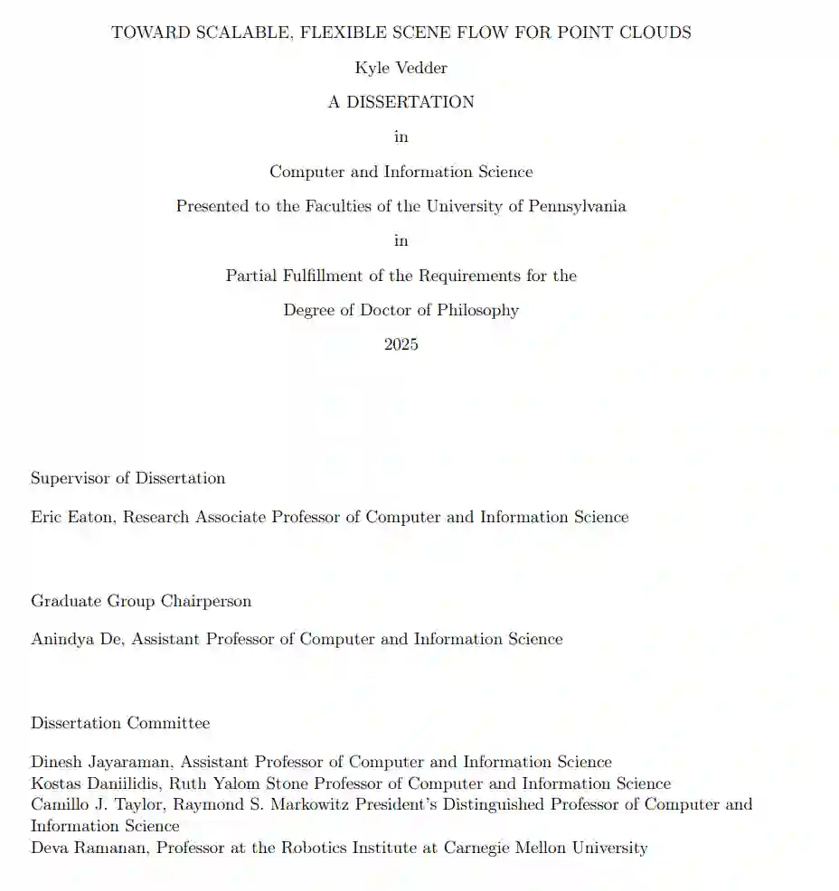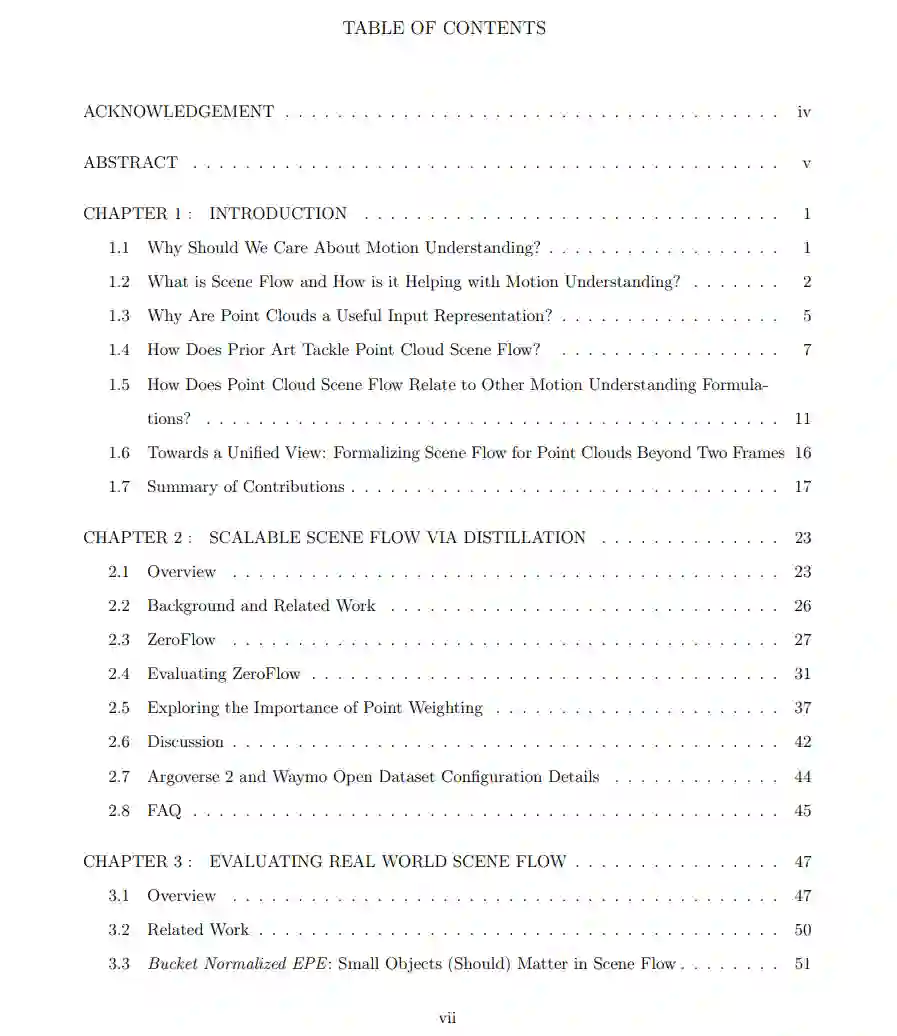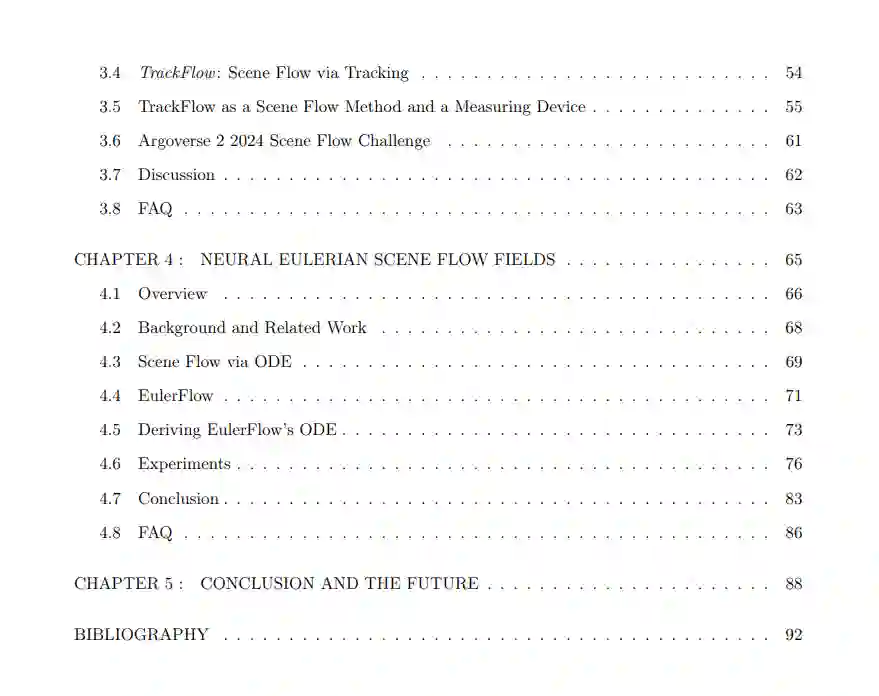 场景流估计是描述时间上连续观测之间的三维运动的任务。本论文旨在为构建具有两个重要特性的场景流估计器奠定基础:一是可扩展性,即它们能够通过更多数据和计算资源提升性能;二是灵活性,即它们能够在多种领域和运动模式中开箱即用,而无需大量的超参数调整。为此,我们解决了该领域中现有方法和评估协议的关键局限性。首先,我们提出了ZeroFlow,这是一种可扩展且完全无监督的方法,利用测试时优化的优势生成高质量的伪标签,然后用于高效训练前馈网络。这种蒸馏流程显著提高了计算效率,在不依赖昂贵的人工标注的情况下,以数量级更快的推理速度实现了最先进的精度。接下来,我们发现了标准评估指标中的一个系统性缺陷,揭示了先前的场景流方法始终无法捕捉到小型或缓慢移动物体(如行人或骑行者)的运动。为了解决这一问题,我们引入了桶归一化端点误差(Bucket Normalized Endpoint Error),这是一种新的类别感知和速度归一化的评估协议,能够更准确、更全面地衡量估计器的质量,特别是强调对关键小型物体的性能。我们通过提出TrackFlow展示了新评估方法的有效性。TrackFlow是一种出奇简单但有效的基线方法,它利用了高质量3D检测器的性能。尽管TrackFlow在现有指标上勉强达到最先进的性能,但在我们改进的评估指标上,可以清楚地看出TrackFlow远远强于其他竞争对手。最后,我们提出了EulerFlow,这是一种无监督方法,通过在整个观测序列上估计常微分方程(ODE),而不仅仅是两个连续观测,从而显著重新定义了场景流估计。EulerFlow在多样化场景中提供了非常强大的流估计,其简单的ODE公式能够在新领域中开箱即用,并实现了包括长时3D点跟踪在内的新兴能力。总的来说,这些贡献代表了在可扩展、灵活和鲁棒的场景流估计方面的重大进展,为未来研究和实际部署奠定了基础,适用于从自动驾驶到机器人等多种应用中的运动理解。