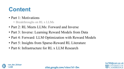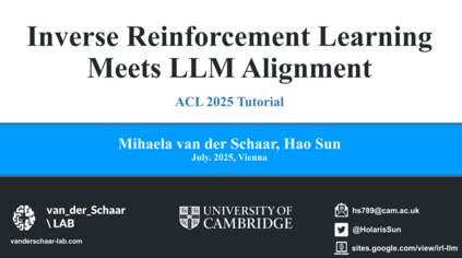 大语言模型(LLM)的对齐问题仍是强化学习领域中最关键的挑战之一。正如 DeepSeek-R1 等模型的成功所展示的那样,提升对齐效果不仅依赖于更优的模型架构,还需对强化学习(RL)和奖励建模有更深入的理解。本教程将探讨逆向强化学习(Inverse Reinforcement Learning, IRL)与大语言模型对齐之间的关联,为研究人员和实践者提供一条结构化的研究路径。 我们将 LLM 对齐建模为一个逆强化学习问题,对比传统强化学习与从人类数据中推断奖励的逆向方法。教程重点聚焦于奖励模型,探讨其如何从不同类型的数据中构建,包括数学推理、二元反馈、偏好数据以及示范行为等。 在理论之外,我们还将探讨基础设施与实践实现,展示如何在几分钟内高效评估基于 IRL 的 LLM 对齐思路。最后,教程将结合稀疏奖励强化学习的相关经验,介绍奖励塑形(reward shaping)、责任归因(credit assignment)以及自对弈(self-play)中获得的启示。 通过本教程,参与者将从理论和实践两个维度深入理解基于 IRL 的大语言模型对齐方法,并掌握高效构建更好对齐模型的核心工具。