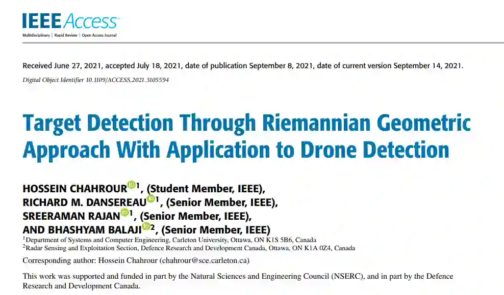 从微分几何学的角度考虑了在有噪声和杂波的情况下对小型无人机的雷达探测。由于无人机的低雷达截面(RCS),特别是在杂波环境中以及无人机在城市地区低速飞行时,无人机探测问题具有挑战性。本文提出了两种探测技术,即黎曼尼-布劳尔矩阵(RBM)和基于角度的混合-布劳尔(ABHB),以提高小样本量和低信杂比(SCR)下的无人机探测概率。这些技术是基于正则化伯格算法(RBA)、布劳尔盘(BD)定理和黎曼平均数和距离。这两种技术都利用RBA从每个快照中获得托普利茨-赫米特正定(THPD)协方差矩阵,并应用BD定理对杂波加噪声的THPD协方差矩阵进行分组。所提出的黎曼-布劳尔矩阵技术是基于杂波加噪声集群的黎曼平均值与潜在目标之间的黎曼距离。所提出的基于角度的混合-布劳尔技术使用欧几里得切空间和黎曼尼均值、黎曼尼中值和潜在目标点之间的黎曼尼测距。流形上潜在目标的角度是利用流形上的余弦定律计算出来的。所提出的检测技术比快速傅里叶变换、基于黎曼距离的矩阵和Kullback-Leibler(KLB)分歧检测器更有优势。两种提议的技术的有效性都用实际数据进行了证明。