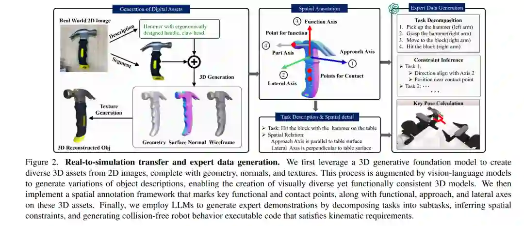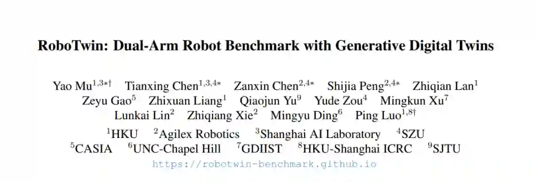 在机器人技术快速发展的背景下,双臂协调与复杂物体操作是构建先进自主系统的关键能力。然而,多样且高质量的演示数据以及贴近真实世界的评估基准的缺乏,严重制约了这一领域的发展。 为了解决这一问题,我们提出了 RoboTwin ——一个生成式数字孪生框架,利用三维生成式基础模型与大型语言模型,生成多样化的专家数据集,并提供面向双臂机器人任务、贴合真实环境的评估平台。 具体而言,RoboTwin 能够从单张二维图像创建多样化的物体数字孪生,生成逼真且可交互的场景。同时,RoboTwin 引入了一个具备空间关系感知能力的代码生成框架,该框架结合物体标注信息与大型语言模型,可拆解任务、识别空间约束,并生成精准的机器人运动控制代码。 我们的框架提供了一个全面的基准测试平台,涵盖仿真数据与真实数据,促进标准化评估,并增强仿真训练与真实部署之间的对齐程度。 我们在开源平台 COBOT Magic Robot 上验证了该方法的有效性。结果表明,基于 RoboTwin 生成数据预训练并结合少量真实样本微调后的策略,相较于仅使用真实数据训练的模型,在单臂任务中成功率提升超过 70%,在双臂任务中提升超过 40%,展现出显著的性能增强潜力,为双臂机器人操作系统的进步提供了有力支撑。