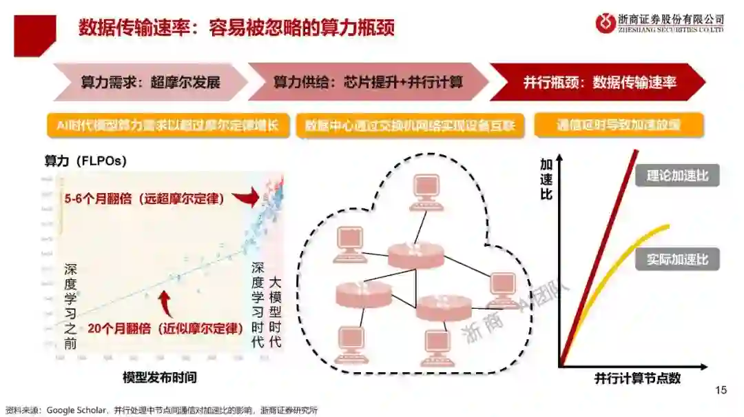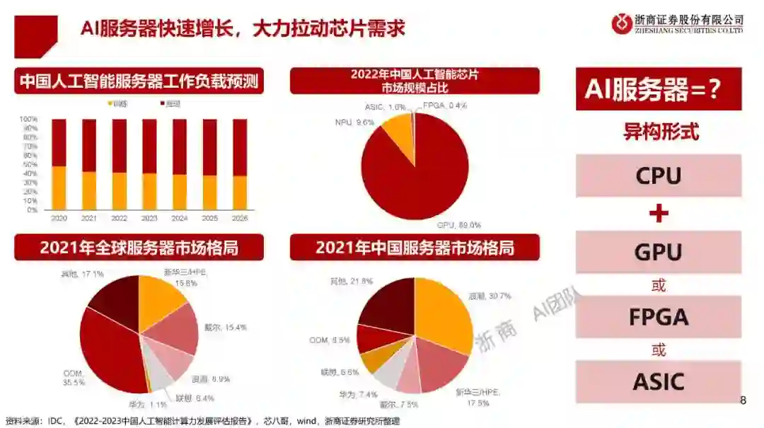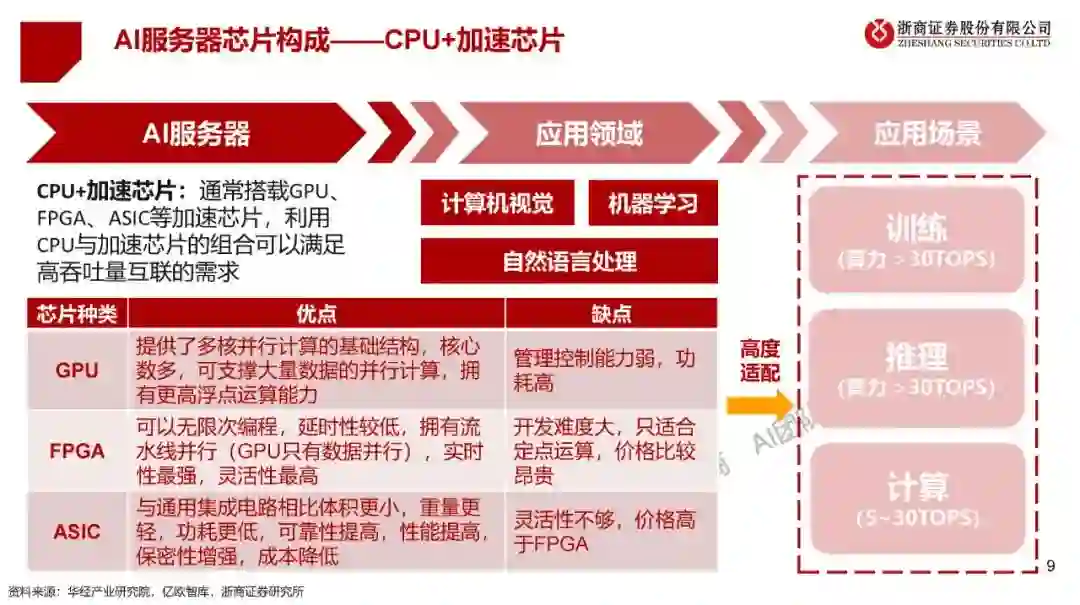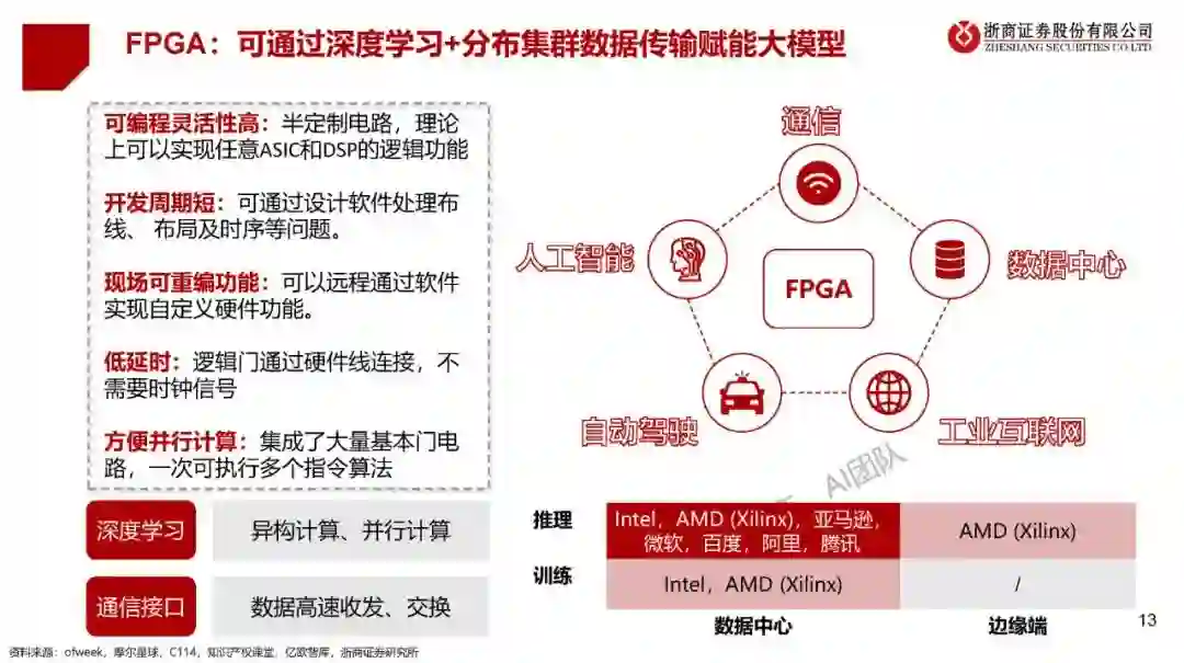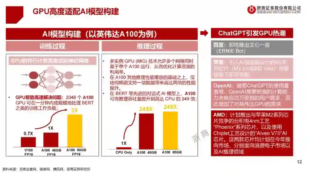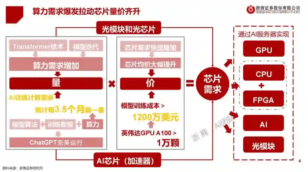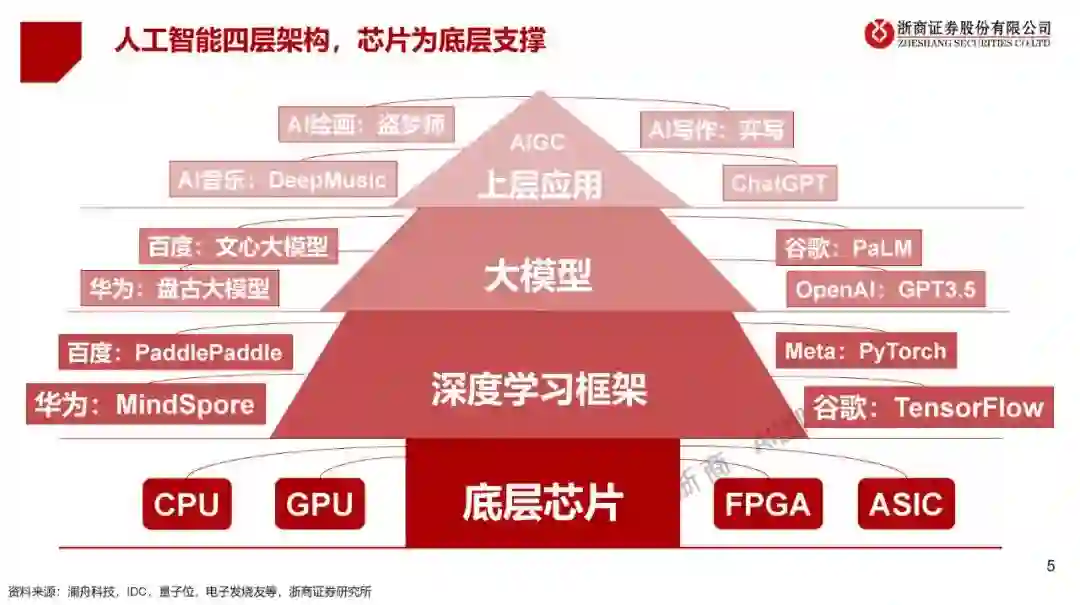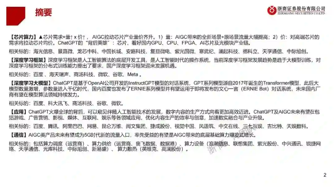 【芯片算力】▲芯片需求=量↑x价↑,AIGC拉动芯片产业量价齐升。1)量:AIGC带来的全新场景+原场景流量大幅提高;2)价:对高端芯片的需求将拉动芯片均价。ChatGPT的“背后英雄”:芯片,看好国内GPU、CPU、FPGA、AI芯片及光模块产业链。 相关标的:海光信息、景嘉微、龙芯中科、中国长城、安路科技、复旦微电、紫光国微、寒武纪、澜起科技、德科立、天孚通信、中际旭创。 【深度学习框架】深度学习框架是人工智能算法的底层开发工具,是人工智能时代的操作系统,当前深度学习框架发展趋势是趋于大模型训练,对深度学习框架的分布式训练能力提出了要求,国产深度学习框架迎来发展机遇。 相关标的:百度、海天瑞声、商汤科技、微软、谷歌、Meta。 【深度学习大模型】ChatGPT是基于OpenAI公司开发的InstructGPT模型的对话系统,GPT系列模型源自2017年诞生的Transformer模型,此后大模型数量激增,参数量进入千亿时代,国内百度也发布了ERNIE系列模型并有望运用于即将发布的文心一言(ERNIEBot)对话系统,未来国内厂商有望在模型算法领域持续发力。 相关标的:百度、科大讯飞、商汤科技、谷歌、微软。 【应用】ChatGPT火爆全球的背后,可以窥见伴随人工智能技术的发展,数字内容的生产方式向着更加高效迈进。ChatGPT及AIGC未来有望在包括游戏、广告营销、影视、媒体、互联网、娱乐等各领域应用,优化内容生产的效率与创意,加速数实融合与产业升级。 相关标的:百度、腾讯、阿里巴巴、网易、昆仑万维、阅文集团、捷成股份、视觉中国、风语筑、中文在线、三七互娱、吉比特、天娱数科。 【通信】AIGC类产品未来有望成为5G时代新的流量入口,率先受益的有望是AIGC带来的底层基础算力爆发式增长。 相关标的:包括算力调度(运营商)、算力供给(运营商、奥飞数据、数据港)、算力设备(浪潮信息、联想集团、紫光股份、中兴通讯、锐捷网络、天孚通信、光库科技、中际旭创、新易盛)、算力散热(英维克、高澜股份)。