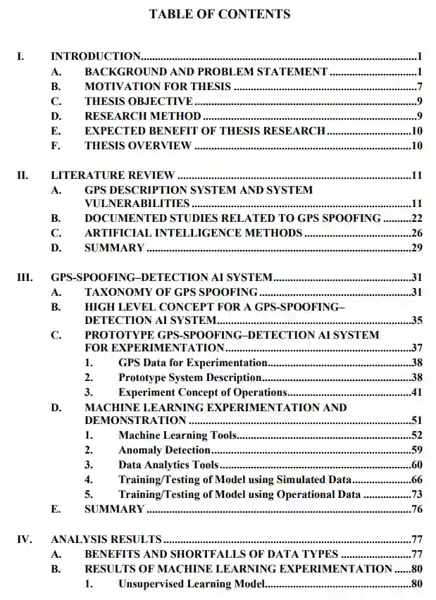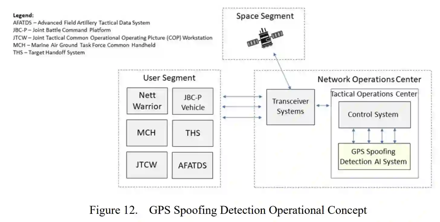 人工智能(AI)方法能否检测出军用全球定位系统(GPS)基础设施上的欺骗行为?利用人工智能和机器学习(ML)工具,展示了对美国防部高级GPS接收器(DAGR)欺骗行为的成功检测。利用系统工程原理,对问题空间进行了分析,包括进行文献审查以确定人工智能的技术水平。这一探索的结果揭示了应用于解决这一问题的新颖解决方案。在早期阶段,考虑了各种系统设计,然后确定了一个同时包含实时和模拟的GPS信息流量的系统。将基于模型的系统工程(MBSE)原则整合到设计概念中,以映射系统层次和互动。Humphreys等人(2008)将GPS欺骗威胁定义为三种技术,即简单攻击、中级攻击和复杂攻击。简单的攻击建立在使用商业GPS信号模拟器、放大器和天线向目标GPS接收器广播信号的概念上。中级欺骗攻击是利用基于接收机的欺骗器,向目标接收器的天线产生欺骗信号。复杂的欺骗攻击是三种方法中最复杂的,有能力改变每个天线发射的载波和码相输出,同时控制发射天线之间的相对码/载波相位(Humphreys等人,2008)。由于成功的GPS欺骗攻击会影响到时间、频率和空间领域,所开发的系统至少必须考虑这些参数。设计概念采用了识别数据集中非明显和非琐碎关系的要求。