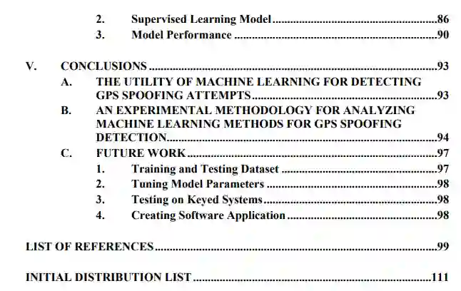 使用一套通常适用于ML、数据科学和统计问题的性能指标来评估监督学习模型的有效性。模型的训练呈现出优秀的结果,所有模型的召回率和精确度都很完美。召回率是一个重要的指标,用于评估一个工具在检测恶意活动方面的效果,如对DAGR的欺骗企图。这项研究的结果表明,如果有适当的工具和权限,对手可以有效地欺骗军用GPS设备。我们在整个论文中开发和展示的工具表明,人工智能方法可以检测到对军用GPS基础设施的欺骗性攻击。