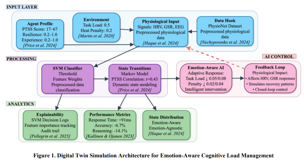 在现代防御行动中,人机编队对于在压力下管理复杂任务至关重要,AI在确保人员监督的同时,辅助进行监视、目标识别和策略调整(Chen等人,2025年)。本研究将“量化自我”运动的原则——即利用持续的生物特征监测进行个性化优化——扩展到军事背景。它展示了实时生理数据如何为AI系统提供信息,以提升作战人员表现,同时防止过度压力。认知负荷,即处理信息所需的脑力消耗,影响操作员的表现,引发压力,从而阻碍决策制定和反应时间(Kallinen & Ojanen, 2023年)。研究表明,军事行动会诱发显著的生理应激反应,这种反应在长时间的培训和作战期间可能持续存在(Corrigan等人,2023年)。当前的防御AI系统常常在信任校准、决策自主性和适应性方面存在困难,经常忽视人类操作员的情绪和认知状态(Chen等人,2025年;Khare等人,2024年)。基于可穿戴传感器技术和情感计算的进步,情感知觉AI系统能够根据压力指标调整任务负荷,为缓解这些影响提供了一种有前景的方法(Vistorte等人,2024年;Haque等人,2024年)。研究表明,心率变异性(HRV)、皮肤电反应(GSR)和脑电图(EEG)等信号反映了情绪状态和认知负荷(Haque等人,2024年;Nechyporenko等人,2024年;McDuff等人,2014年)。HRV、GSR和EEG的多模态传感器融合提高了压力预测的准确性,支持向量机(SVM)分类器在受控环境中达到了85-95%的性能(Raza等人,2024年;Gohumpu等人,2023年)。本研究提出了一个模拟框架,用于评估情感知觉AI在高压力防御场景下管理认知负荷的有效性。与传统模拟不同,该模型使用来自“汽车驾驶员压力识别数据集”(Healey & Picard, 2005年)的真实生理数据(HRV和GSR)来精确模拟人的压力状态。该模拟采用基于马尔可夫的离散事件模型来捕捉“平静”、“压力”和“过载”状态之间的转移,并利用了100个具有不同原型的虚拟智能体。主要目标是比较能根据压力检测调整任务负荷的“情感知觉AI”与不能自适应的“情绪不感知AI”。结果表明,情感知觉AI更可能使操作员保持在“平静”状态,从而提升如反应时间、视觉准确性和推理得分等性能指标。