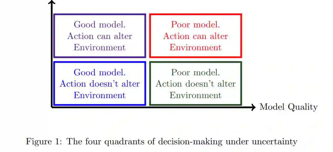 本文对强化学习(RL)进行了简要的综述,特别强调随机逼近(SA)作为一个统一的主题。本文的范围包括马尔可夫奖励过程、马尔可夫决策过程、随机近似方法以及时间差分学习和Q-learning等广泛使用的算法。强化学习是一个庞大的主题,这篇简短的综述几乎无法准确地描述这个主题。有一些关于RL的优秀文本,如[4,27,34,33]。[25, 22, 3, 23, 2, 9, 10]对随机近似(SA)算法的动力学进行了分析。有兴趣的读者可以查阅这些来源以获得更多信息。在本综述中,用"强化学习"一词来指具有不确定模型的决策,当前的行动会改变系统的未来行为。因此,如果在未来的某个时间采取相同的行动,结果可能就不一样了。这个额外的特征将强化学习与不确定性下的“单纯”决策区分开来。图1相当武断地将决策问题分为四个象限。现在对每个象限的例子作简要说明。