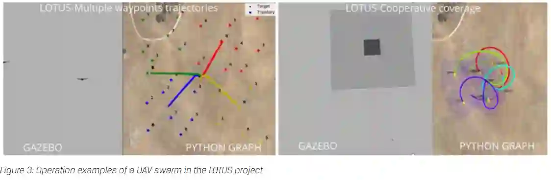 LOTUS项目(低可观测战术无人机系统)是一个EDIDP项目,财团由来自希腊和塞浦路斯的9个合作伙伴以及来自西班牙和荷兰的另外两个合作伙伴组成。该项目于2020年12月启动,持续时间为45个月,由Intracom防御公司领导。通过LOTUS项目,一个最先进的无人驾驶飞行器(UAV)系统被设计用于战术空中侦察和监视任务。它拥有几个关键特征,包括躲避敌军的隐身特性、对峙作战能力、适航性和基于北约标准的互操作性,以及考虑到网络安全的可靠通信。此外,该系统还广泛采用了人工智能,确保其能够高度准确地执行复杂的任务。该母舰配备了多个ISR传感器,设计为低可观察性和高续航能力,并加入了自我保护系统,以应对敌人的威胁。它可以部署四个管状发射的可折叠翼无人机,这些无人机具有先进的自主功能,使它们能够执行复杂的ISR任务。母舰和无人机共同组成了一个强大的蜂群,可以无缝运行,为地面的决策者提供关键的情报和监视数据。在图3中,地面目标的智能任务分配(左)和合作覆盖(右)是通过帕特雷大学开发的蜂群算法执行的。