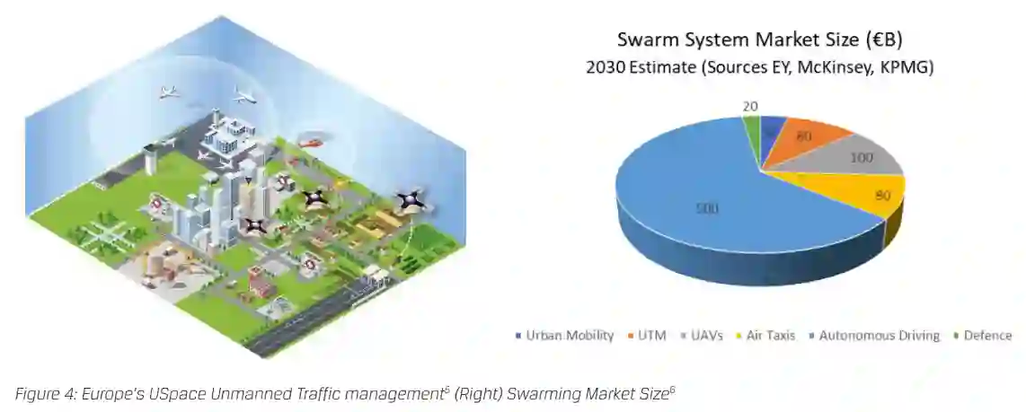 集群可以在多个具有社会和经济利益的领域做出重大贡献,如无人驾驶交通管理、自动驾驶和城市交通,所有这些都利用了集群技术。图3显示,根据知名金融机构的预测,到2030年,集群系统的综合市场领域可以达到近9000亿欧元,对民用领域有明显影响。