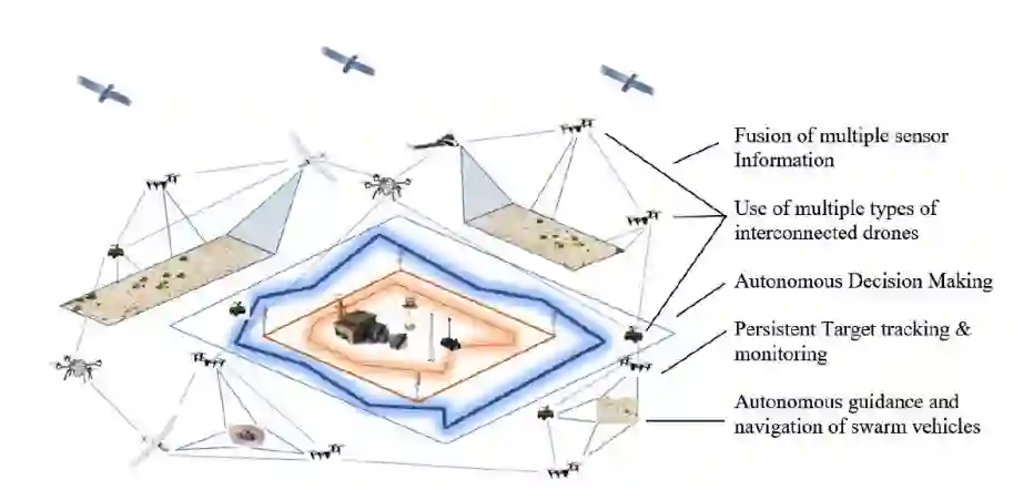 无人系统集群(UxVs)由大量异质无人车(空中、陆地、海上)组成,作为自主 "系统"的智能群体运作,具有决策、目标跟踪、制导和控制、传感器融合和指挥能力,作为单一智能群(自主系统)运作。如果利用机器人、人工智能(AI)、通信、制导和控制、传感器融合、航空航天和无人交通管理(UTM)等领域的发展,将无人系统群设计成蜂群或鸟群,使其具有必要的智能和自主性,就能为国防部门创造颠覆性的、改变游戏规则的能力,将数量和智能、智慧技术的优势相结合。无人系统群可以创造出前所未有的能力,可以提高欧洲的安全和国防能力,同时对其他非国防部门产生颠覆性影响,如城市交通、UTM、自动驾驶或机器人技术。在国防方面,无人驾驶车辆的联合使用可以限制人类在危险环境中的风险/暴露,允许枯燥和肮脏的军事行动发生,如对大面积地区(如地中海、欧洲边界)的持续监测,甚至可以在未来的军事场景中用来迷惑和压倒对手。图1显示了一个多领域(空-空-地-海-空)的无人系统群概念,用于保护和提供对高价值资产(如军营/驻地)的持续监视,这是在2016年EDA研发试点项目EuroSWARM中首次提出。