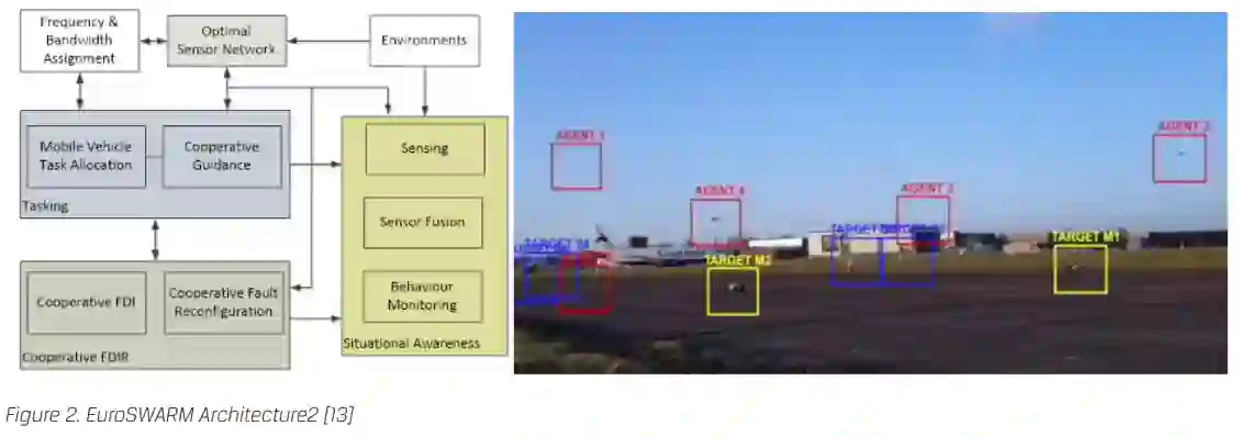 EuroSWARM[13]项目(为国防应用中的无人机蜂群开发技术)是欧洲防务局的一个项目,该项目于2016年11月-2017年11月举行,联合体由来自希腊、英国、法国和瑞典的4个合作伙伴组成。该项目的关键技术,包括静态传感器网络设计、移动传感器任务分配和信息融合,能够开发出用于商用无人驾驶车辆的新型算法。这些算法具有低计算能力要求、灵活性和可重新配置性。在图2中,介绍了项目的结构和使用的模块。基于贪婪地排除技术的任务分配算法确保了实时的接近最优的任务分配,允许在快速变化的环境中进行有效的蜂群控制。通过无人机的空中传感、自主行为监测的一般框架和轨迹分析工具,实现了增强的态势感知。传感器融合技术和分散的跟踪算法支持自动目标检测和跟踪,增加了系统的可靠性和容错性。为移动车辆设计了一个反应式和分布式合作制导法,解决了任务和安全目标,以及车辆和静态传感器网络之间的相互作用。这些蜂群技术在户外环境中的实际演示验证了这些算法和技术在军事和执法应用中持续监测的有效性。