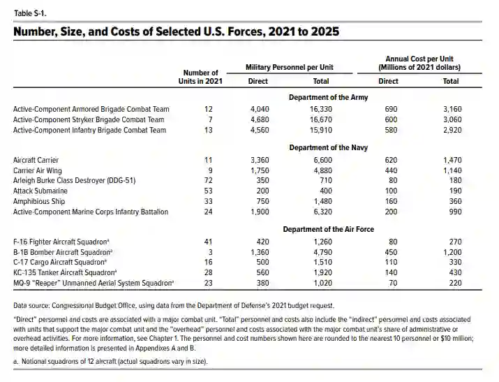 在此分析中,CBO 检查了 O&S 预算涵盖的活动、资金和人员,并将其归于部队结构的主要组成部分。对于主要作战单位,成本和人员数量的估计包括一个作战单位的许多支援单位及其在行政或间接活动中的总份额。由此产生的“完全支持单位”的估计让有兴趣改变军队部队结构的决策者了解这些变化将涉及的成本和人员数量。