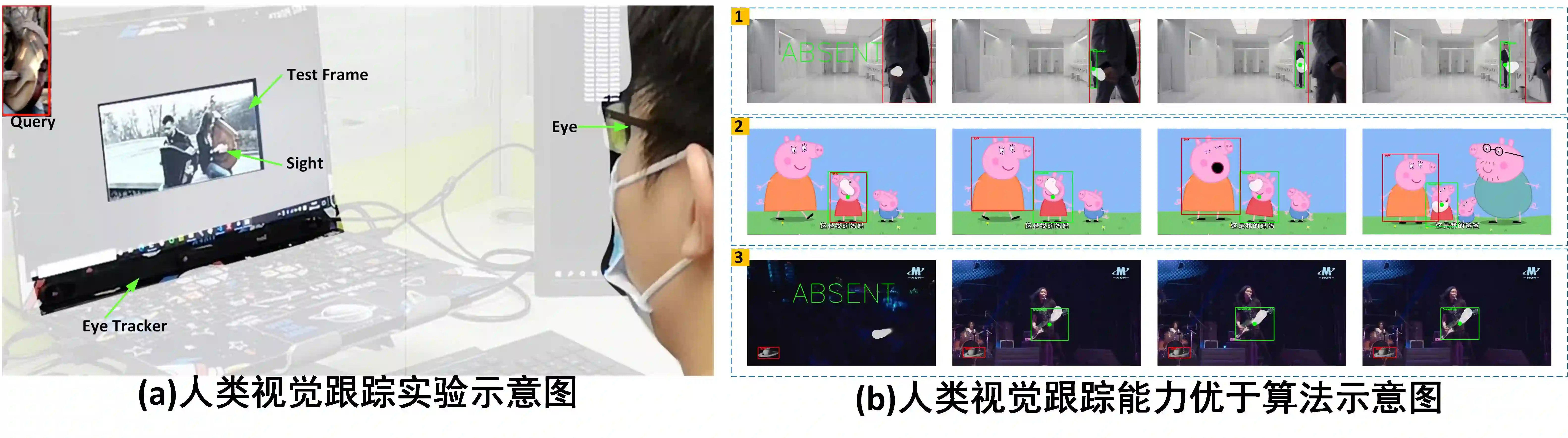 类人跟踪新任务:人类可以在任意场景中持续定位任意目标,在复杂场景尤其是对抗环境下依旧保持鲁棒跟踪能力。然而,目前的单目标跟踪任务因包含众多约束条件而被限制在简单场景下,导致现有跟踪方法无法具备“类人”的鲁棒跟踪能力。因此,团队首先拓展单目标跟踪任务的边界,并提出全局实例跟踪任务(Global Instance Tracking, GIT),旨在对人类视觉跟踪能力进行精确建模,使任务的应用范围进一步拓展至对抗场景中。