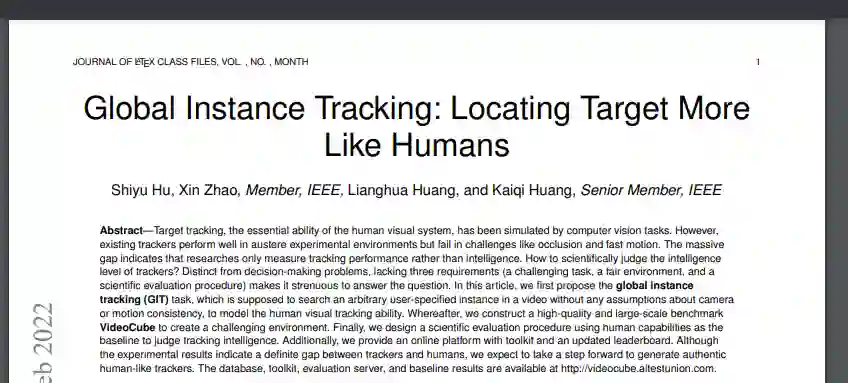 综上,这一工作以“人机对抗”为引导,在任务设定、环境构建和智能评估三个维度进行创新,成功将“视觉图灵”应用于单目标跟踪任务中,为实现近似或超越人类的跟踪算法提供研究基础,同时也为基于“视觉图灵”开展计算机视觉任务研究提供一种可行的范式。相关研究成果Global Instance Tracking: Locating Target More Like Humans于2022年2月被IEEETransactions on Pattern Analysis and Machine Intelligence(TPAMI)期刊正式录用。