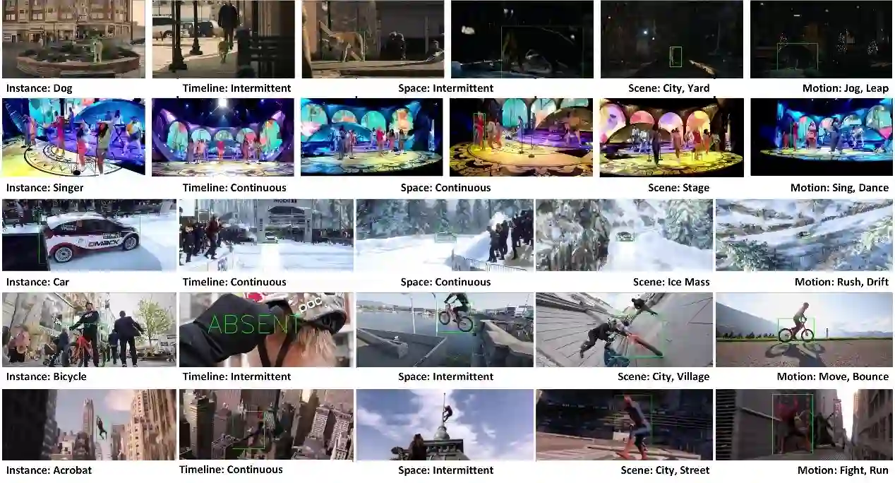 图1 VideoCube代表性视频示意图。每段视频均包含丰富的挑战因素,并充分涵盖被其他数据集所忽略的复杂场景和对抗场景,实现对真实世界的精确刻画。