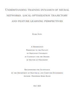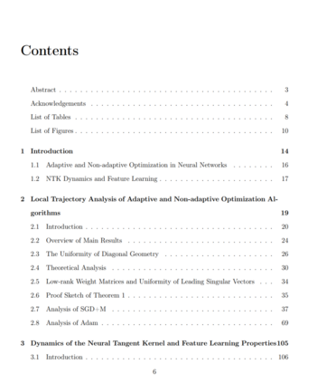 在深度神经网络中,常常遇到损失函数是高维的、非凸的和非平滑的情况。在这些大规模的设置中,传统优化文献中的理论边界(这些文献集中在假设一些全局最坏情况参数的黑箱分析)可能变得没有意义。此外,优化算法与损失几何之间可能存在复杂的交互现象:最近的研究表明,优化过程中遇到的迭代几何特征在很大程度上取决于优化算法的选择及其超参数。这些挑战促使我们进行局部而非全局、算法相关的轨迹分析,并详细追踪训练动态。 本论文将重点研究神经网络中优化算法的局部轨迹,并尝试从优化和特征学习的角度理解其训练动态。从优化角度出发,我们将比较自适应优化方法(例如Adam)与非自适应方法的局部损失几何,并展示自适应方法能够将其轨迹偏向于具有某种均匀性特性的区域。接下来,我们将证明这一均匀性特性是加速优化的一个促成因素。 从特征学习的角度,本论文将关注神经切线核(NTK)的演化,并展示具有大学习率的梯度下降动态倾向于增加NTK与目标函数之间的对齐度。随后,我们将讨论这一对齐特性与特征学习以及神经网络泛化能力之间的联系。我们还将提供理论分析,以理解我们经验观察背后的机制。最后,我们将通过讨论潜在的未来方向来总结本论文,旨在将我们的工作推广到更复杂的设置中,以便更好地理解实际中的训练动态。