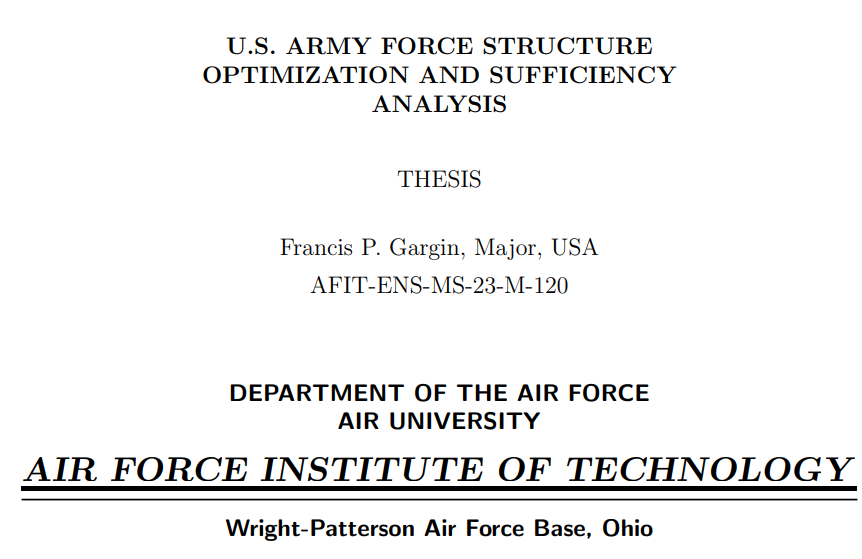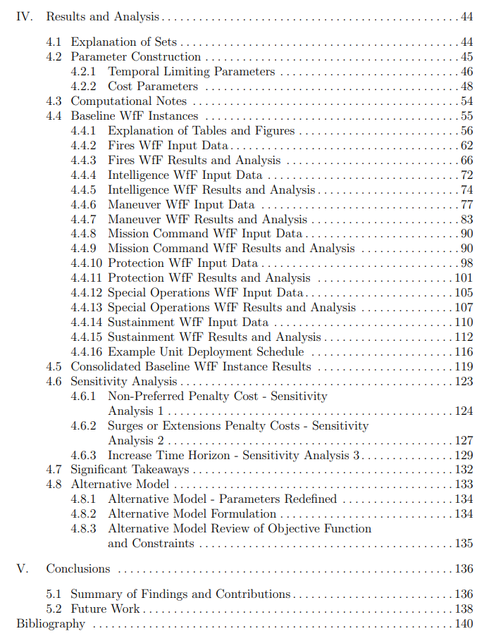 除导言一章外,本论文的结构如下。第二章概述了美国陆军如何以及为何根据 ReARMM 部署部队。本章的文献综述还概述了有关劳动力调度和劳动力充足性研究方法的相关学术文献。本论文还研究了与本研究重点相似的问题类型,包括:分配问题、集合覆盖问题、目标规划和多目标优化。第三章介绍了用于解决本研究问题陈述的整数规划编程模型。在第四章中,针对各种测试实例求解了 IP 模型,并对模型参数变化的影响进行了敏感性分析。最后,第五章总结了本研究的主要发现,并讨论了未来的研究方向。