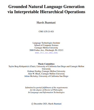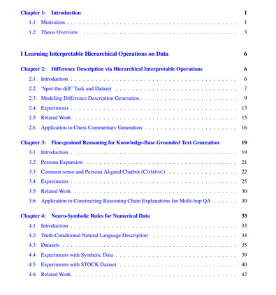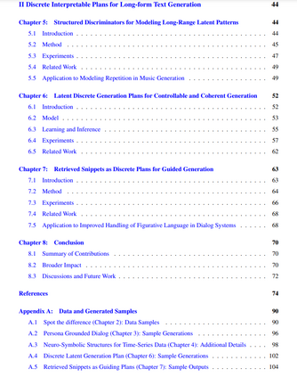 在论文的前半部分,我将讨论在不同的基础自然语言生成任务中向神经模型添加特定的离散层级操作,如图像和表格标题生成、对话响应生成以及构建多跳问题回答的推理链。这些任务涵盖了各种数据模态(包括图像、表格数据、数值数据和知识库)。在论文的后半部分,我将描述用于文本解码器中的内容规划的层级方法,研究诗歌生成中的押韵模式以及用于连贯叙事文本生成的离散计划。