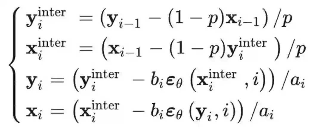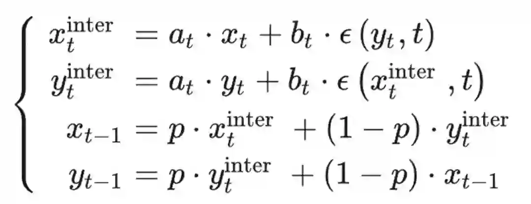 ****EDICT**EDICT 是基于 DDIM 的启发式算法,借鉴了可逆网络的做法,有两个相互糅合的采样链。 其逆过程如下,精确可逆: